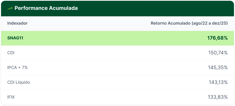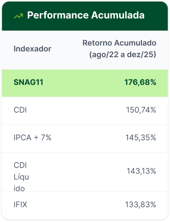 Com gestão ativa, foco em rendimentos mensais e zero inadimplência desde o início, o SNAG11 se consolidou como referência na indústria de FIAGROs.