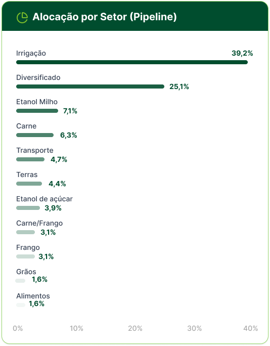 Atualmente, o fundo conta com 12 ativos em 6 setores, com foco em CRAs, imóveis rurais e FIAGROs. Com a 5ª emissão, o SNAG11 busca agregar ativos que ampliem a exposição a diferentes segmentos do agronegócio brasileiro — irrigação, etanol, carnes, terras, transporte, alimentos — mitigando riscos e fortalecendo a tese de investimento.
