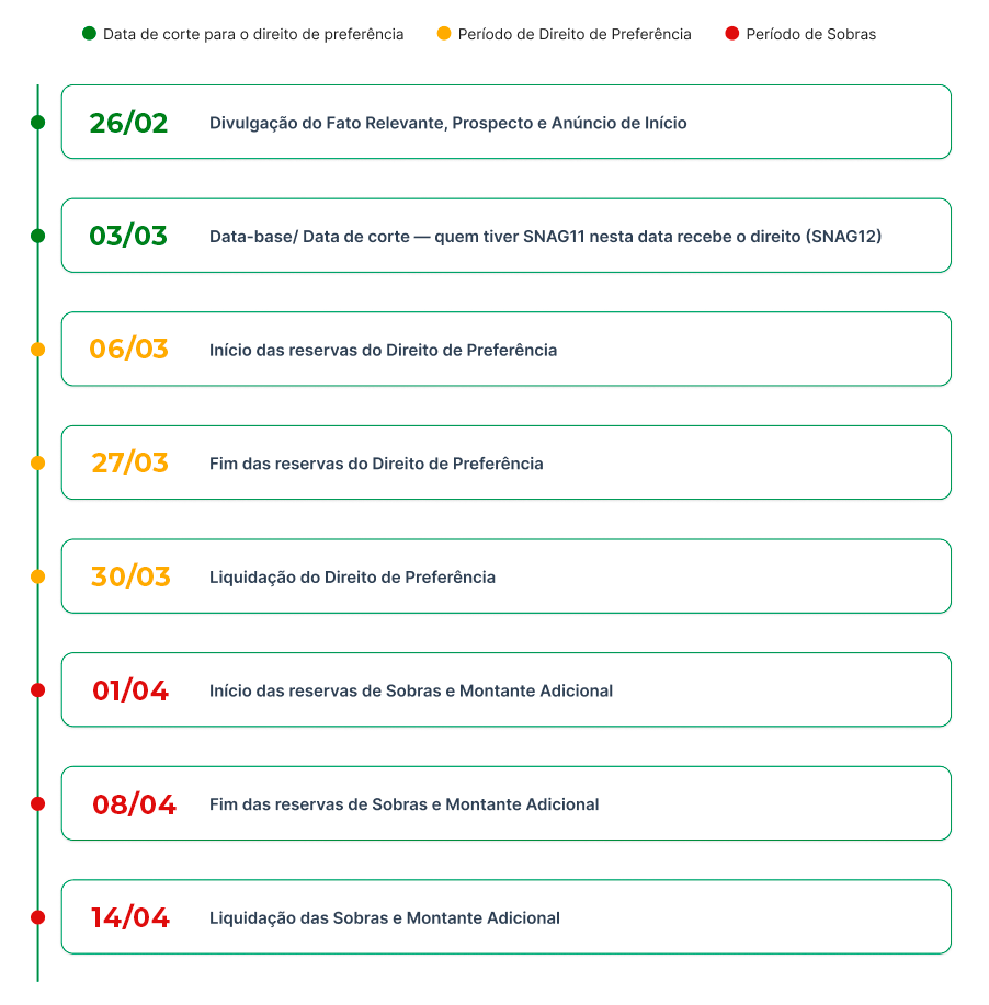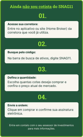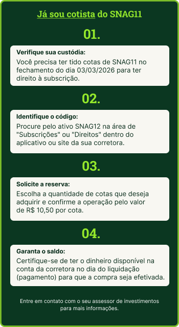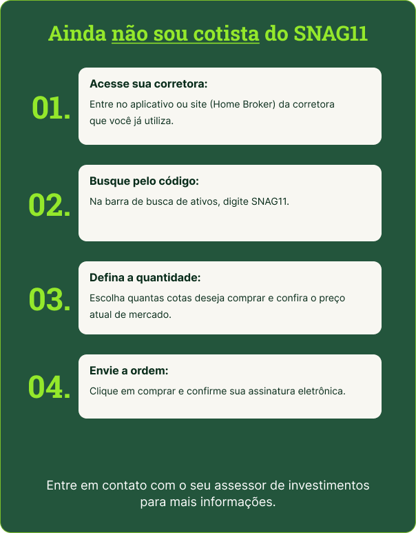 LEIA O PROSPECTO E O REGULAMENTO DO FUNDO ANTES DE ACEITAR A OFERTA, EM ESPECIAL A SEÇÃO DOS FATORES DE RISCO. Entre em contato com o seu assessor de investimentos e avalie a adequação do investimento ao seu perfil. Os fundos de investimento não contam com garantia do administrador do fundo, do gestor da carteira, de qualquer mecanismo de seguro ou do Fundo Garantidor de Crédito (FGC). A seguir seguem listados os 5 principais fatores de risco da Oferta e do Fundo:(i) Risco de não concretização da Oferta,(ii) Risco do Estudo de Viabilidade, (iii) Risco de não Materialização das Perspectivas Contidas nos Documentos da Oferta,(iv) Acontecimentos e a percepção de riscos em outros países, sobretudo em países de economia emergente e nos Estados Unidos, podem prejudicar o preço de mercado dos valores mobiliários brasileiros, inclusive o preço de mercado das Cotas e(v) Risco da Distribuição Parcial. O Prospecto está disponível na seguinte página: https://www.suno.com.br/asset/fundos/snag11/ (Para acessar o documento, neste website acessar o botão “Relat. em destaque”). O REGISTRO DA OFERTA NÃO IMPLICA, POR PARTE DA CVM, EM GARANTIA DE VERACIDADE DAS INFORMAÇÕES PRESTADAS OU EM JULGAMENTO SOBRE A QUALIDADE DO FUNDO OU DAS COTAS A SEREM DISTRIBUÍDAS. AS INFORMAÇÕES APRESENTADAS NESTE MATERIAL SÃO BASEADAS NA ANÁLISE E NA ESTRATÉGIA DE INVESTIMENTO QUE O GESTOR PRETENDE ADOTAR PARA O FUNDO. OS RESULTADOS REAIS DO FUNDO PODERÃO SER SIGNIFICATIVAMENTE DIFERENTES. NÃO HÁ GARANTIA DE QUE A CARTEIRA DO FUNDO APRESENTARÁ CARACTERÍSTICAS SEMELHANTES ÀS APRESENTADAS NESTE MATERIAL. A RENTABILIDADE PASSADA NÃO REPRESENTA GARANTIA DE RENTABILIDADE FUTURA. A CVM NÃO REALIZOU ANÁLISE PRÉVIA DO CONTEÚDO DO PROSPECTO NEM DOS DOCUMENTOS DA OFERTA. Saiba mais em: https://www.suno.com.br/asset/fundos/snag11/