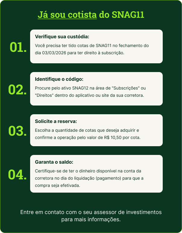 O SNAG11, o FIAGRO referência do Brasil, abre sua 5ª emissão. 120 mil cotistas, R$ 619 milhões de patrimônio e zero inadimplência.