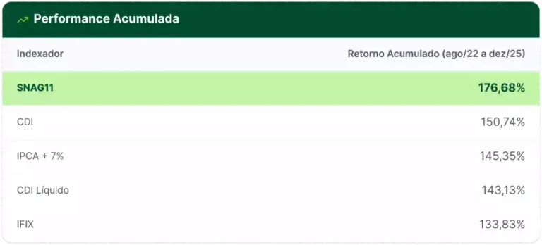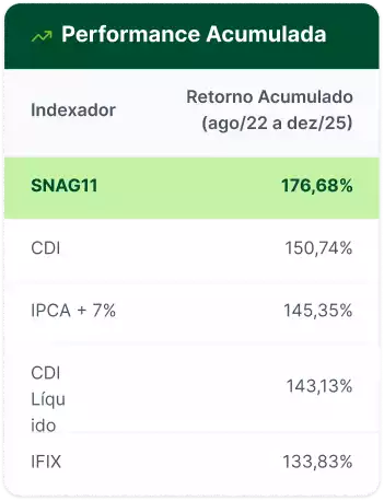 Com gestão ativa, foco em rendimentos mensais e zero inadimplência desde o início, o SNAG11 se consolidou como referência na indústria de FIAGROs.